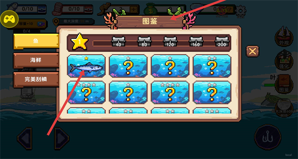 4、使用新裝備捕撈更多魚類,點開圖鑒可以看收集進度優(yōu)先釣已解鎖魚類,完成圖鑒解鎖獎勵拓展游戲內(nèi)容玩法。