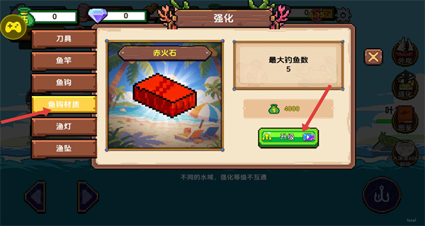 3、玩家還可以升級魚鉤,點擊選魚鉤材質(zhì)欄升級赤火石提升最大釣魚數(shù),一次釣更多魚加快資源積累速度。