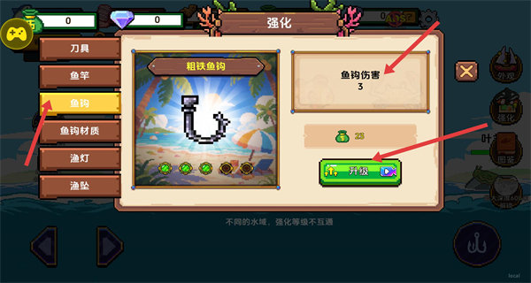 2、切換到魚鉤強化,可以用金幣升級粗鐵魚鉤增加魚鉤傷害,使得釣魚成功率更高多釣稀有魚。