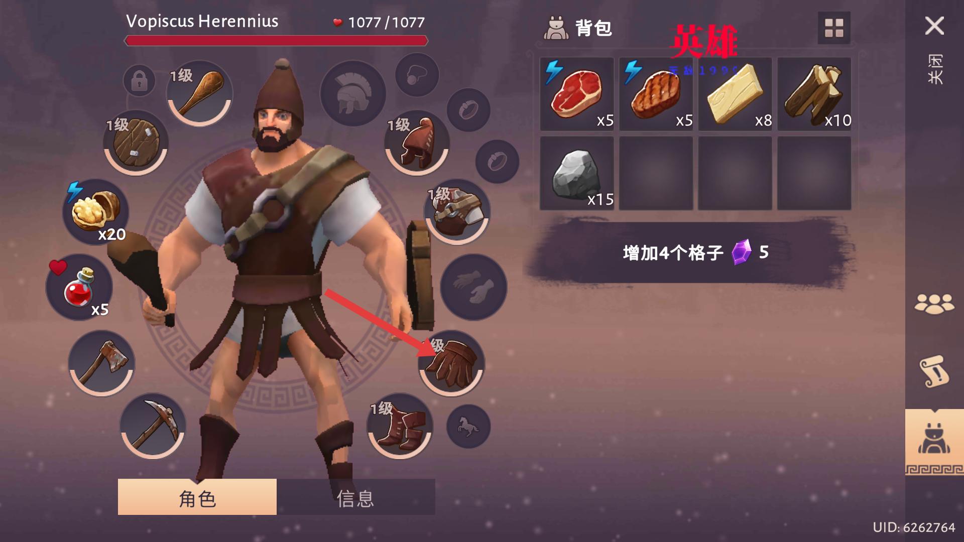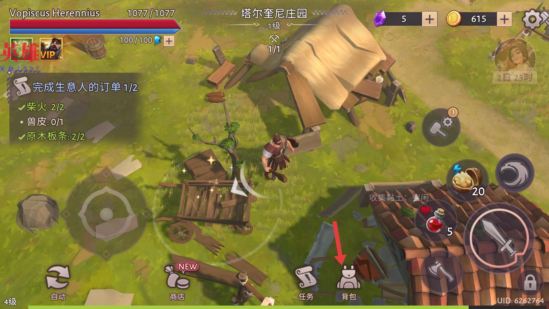 1、點擊背包按鈕查看資源和裝備,同時推進完成生意人的訂單任務(wù),收集獸皮以完成訂單,提升莊園發(fā)展進度。