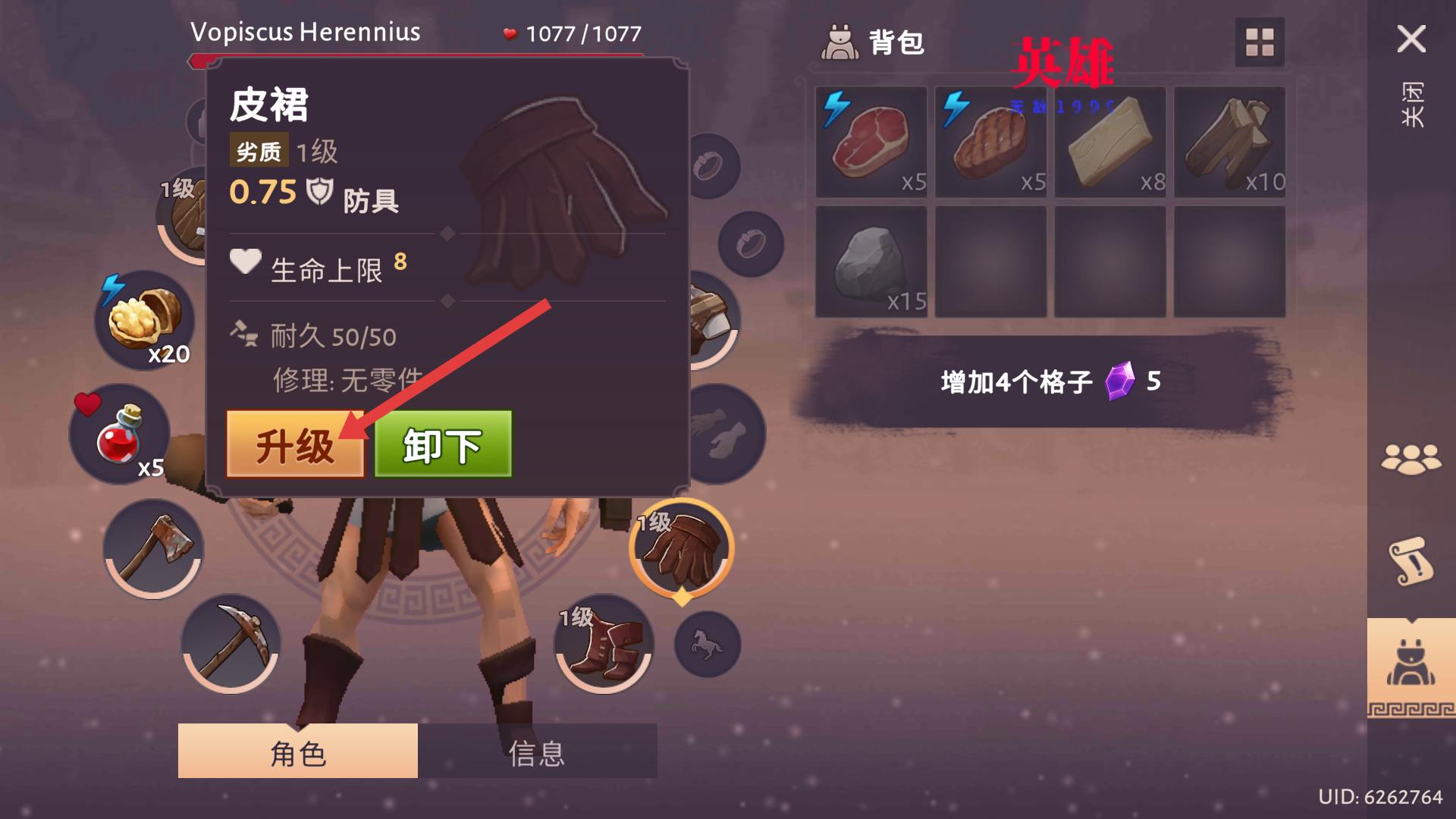 2、進入背包界面后,查看角色可裝備的物品,如1級皮裙等,根據(jù)需求選擇裝備,提升角色的防御和生命上限,增強角色生存能力。