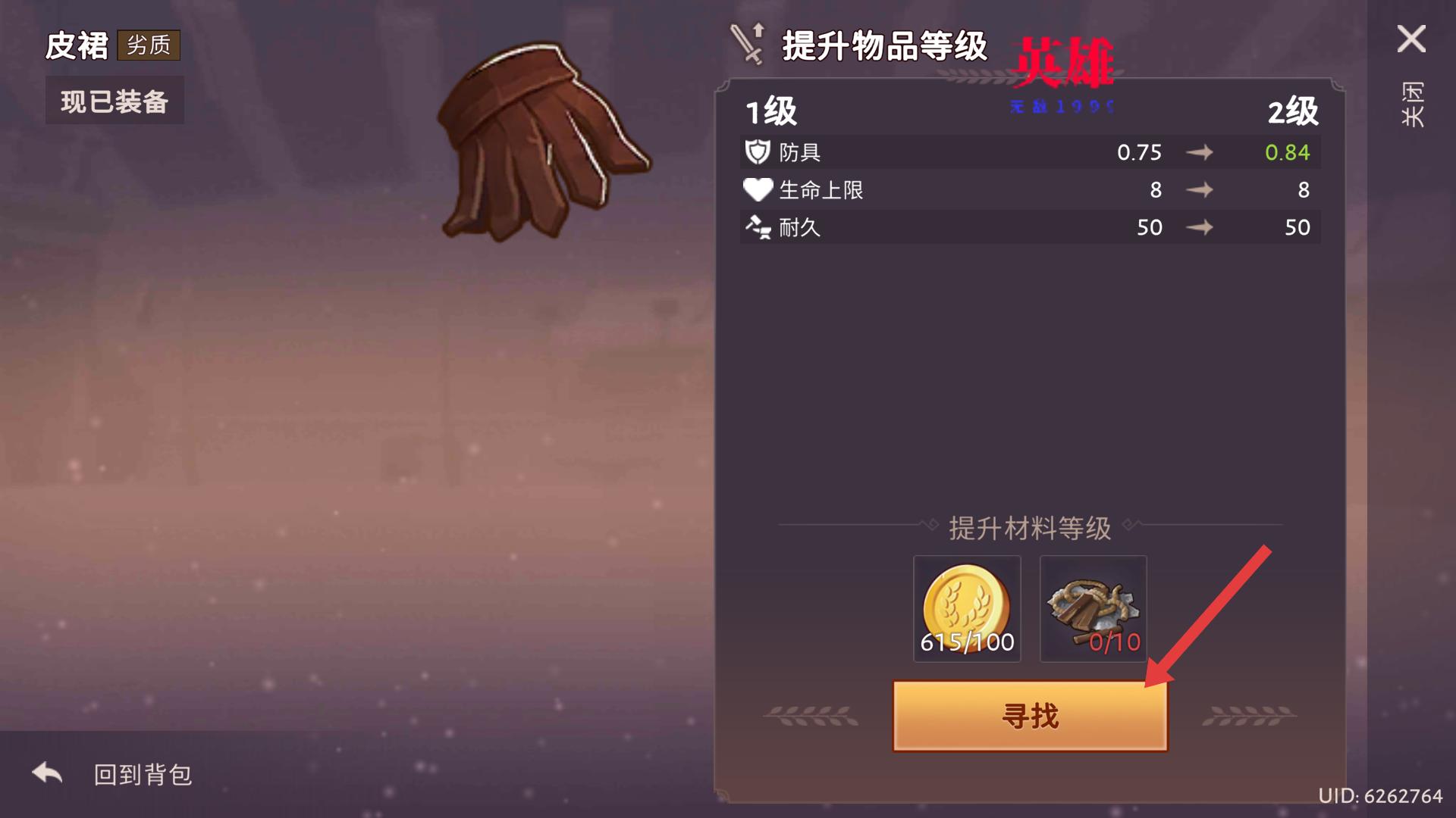3、在裝備詳情界面,點擊升級按鈕可提升裝備等級,增強裝備屬性,如皮裙升級后防御提升,讓角色在莊園探索和任務(wù)中更具優(yōu)勢。