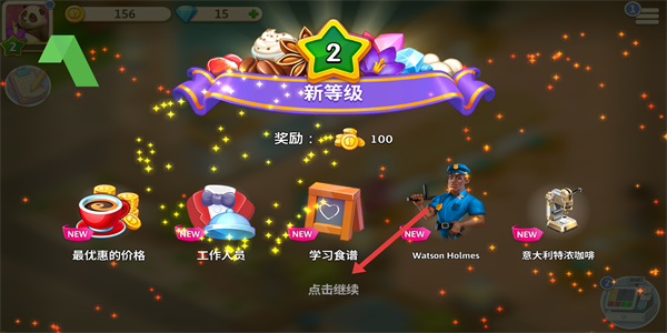 4、最后完成任務(wù)后提升等級(jí),獲得金幣及新的功能、物品等獎(jiǎng)勵(lì),點(diǎn)擊繼續(xù)即可開(kāi)啟新的游戲內(nèi)容。