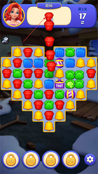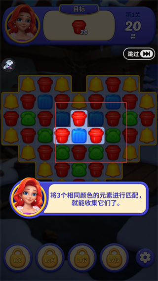 1、點(diǎn)擊從第1關(guān)開(kāi)始在充滿(mǎn)冰雪元素的場(chǎng)景中開(kāi)啟消除之旅,每關(guān)都有明確的消除目標(biāo),完成目標(biāo)即可通關(guān)。
