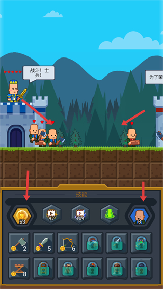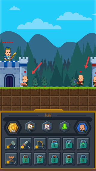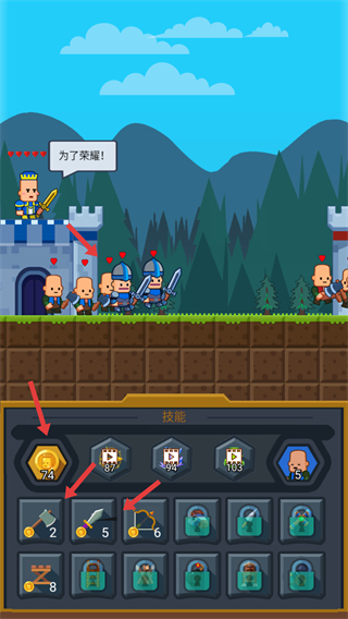 3、不斷解鎖更高級(jí)的士兵如裝備精良的騎士提升軍隊(duì)?wèi)?zhàn)力,利用金幣解鎖技能欄中的各類武器和建筑進(jìn)一步增強(qiáng)軍隊(duì)實(shí)力和防御能力。