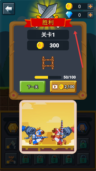 4、成功擊敗敵方后可獲得大量金幣獎(jiǎng)勵(lì)點(diǎn)擊下一關(guān)繼續(xù)挑戰(zhàn),利用獎(jiǎng)勵(lì)的金幣解鎖更多士兵和技能持續(xù)推進(jìn)游戲進(jìn)程解鎖更高難度的關(guān)卡。