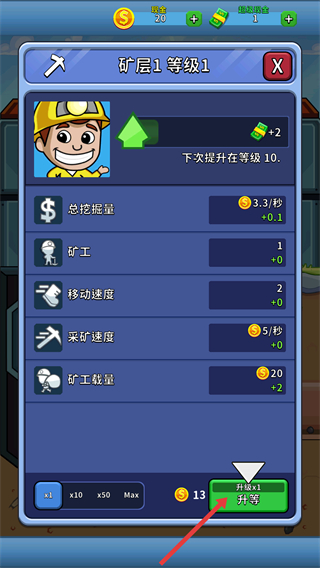 1、在礦層升級界面,可提升總挖掘量、礦工數(shù)量等屬性,點擊升級按鈕,消耗金幣提升礦層等級,增強采礦能力。