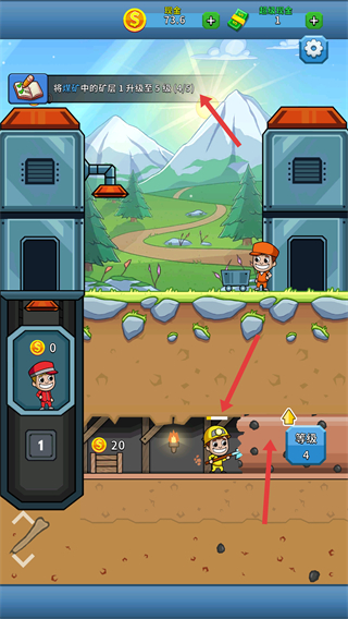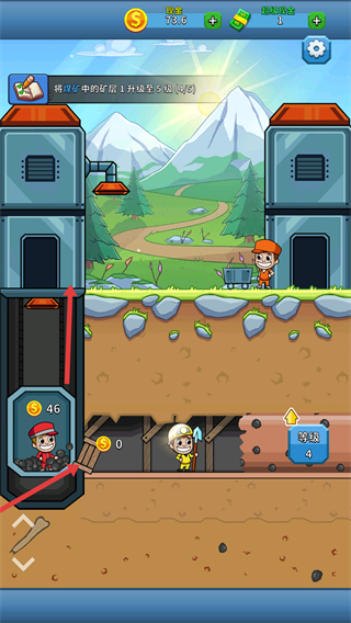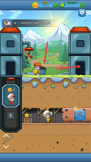2、礦層升級后,礦工在礦洞里采礦,可看到礦層等級提升的任務提示,同時礦工在礦層里挖掘礦石,獲取金幣。