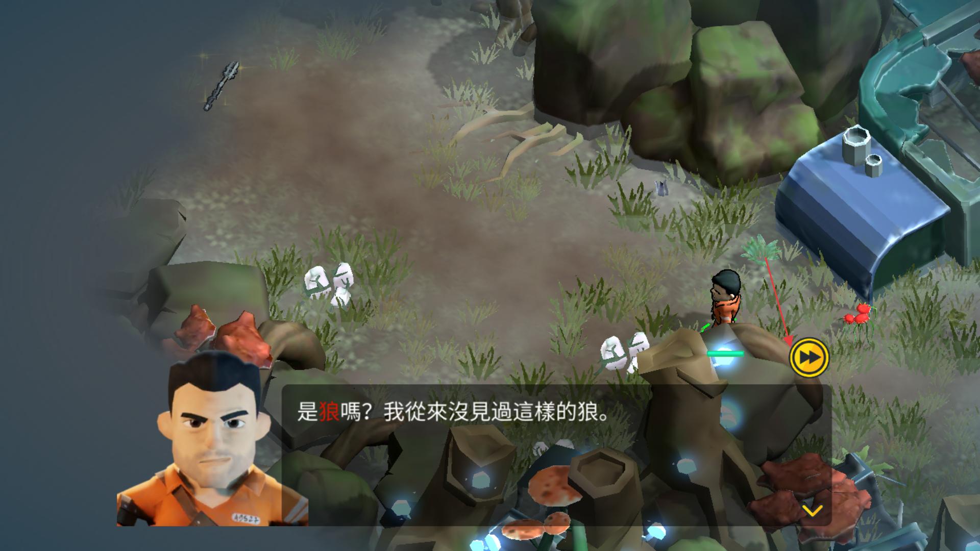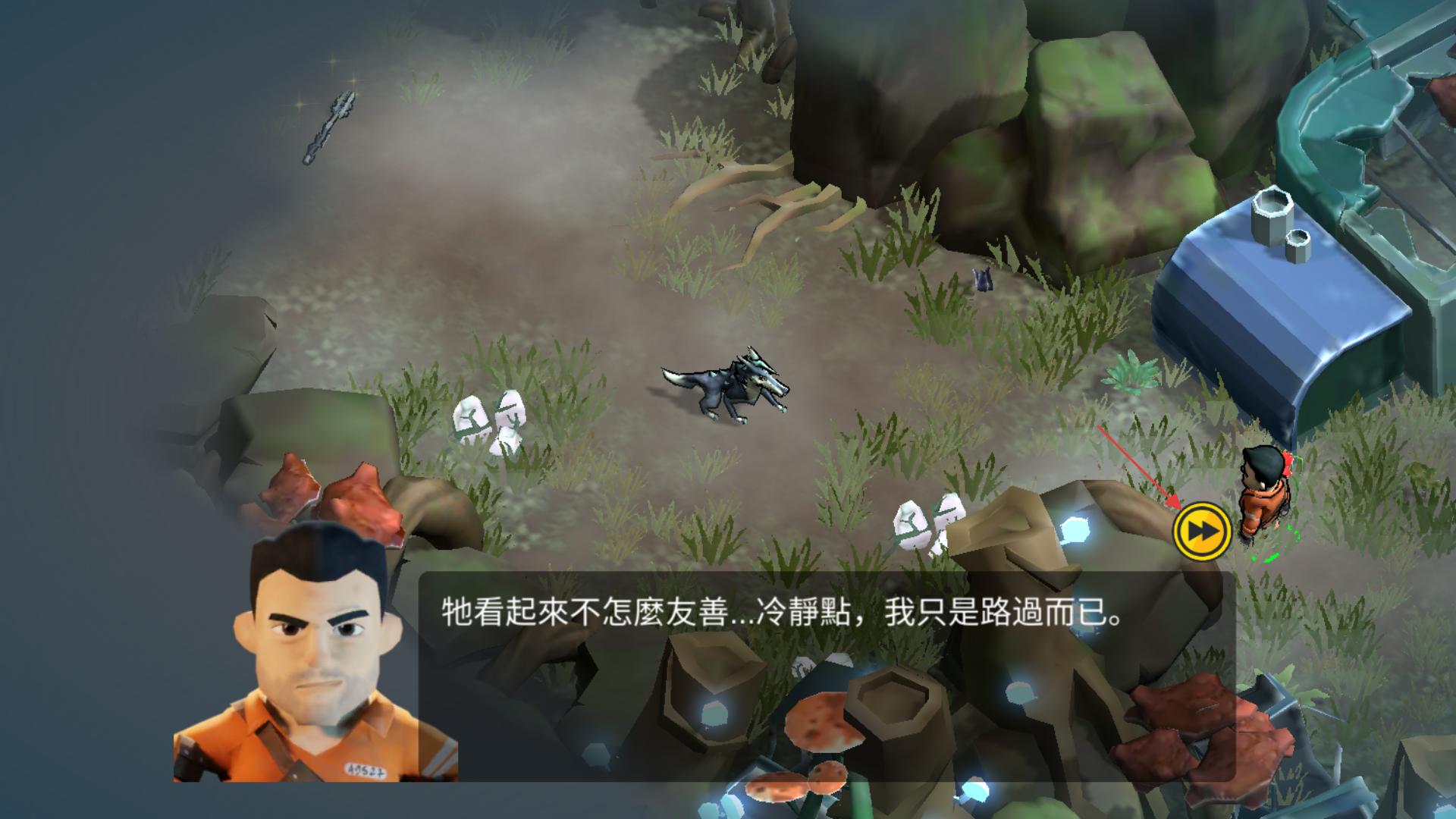 1、進(jìn)入游戲后,看到角色旁的箭頭按鈕,點(diǎn)擊該按鈕,推進(jìn)劇情,觸發(fā)與野獸的遭遇對(duì)話,開啟生存任務(wù)的第一步。