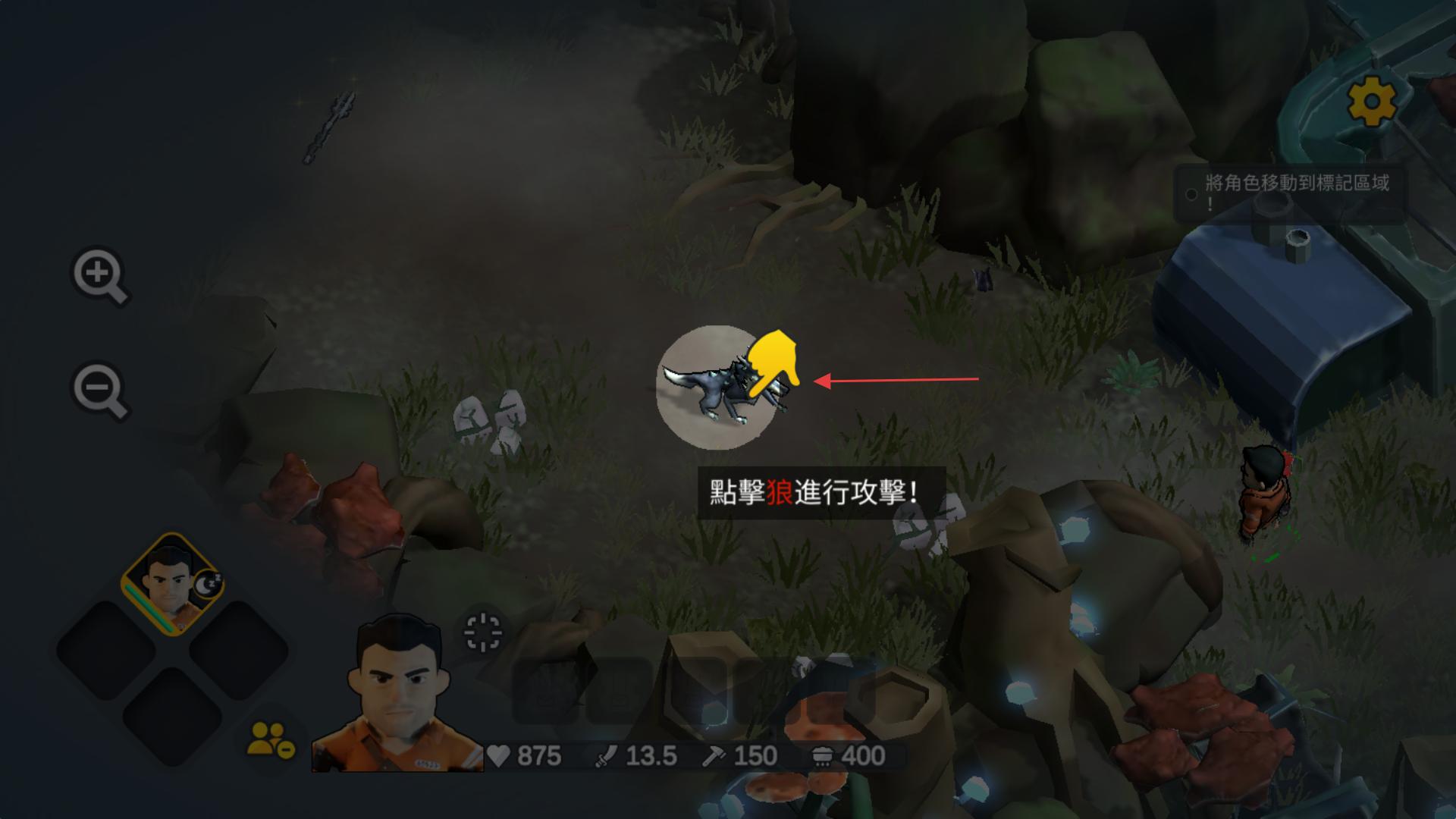 2、在遭遇野獸后看到提示點(diǎn)擊狼進(jìn)行攻擊,點(diǎn)擊狼,發(fā)動(dòng)攻擊,完成與野獸的戰(zhàn)斗環(huán)節(jié),推進(jìn)生存任務(wù)的進(jìn)程。