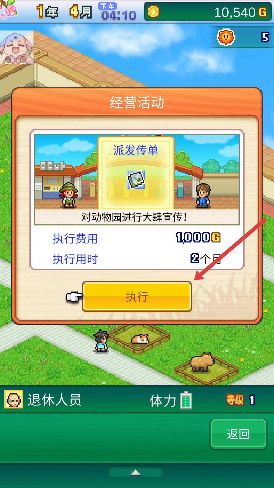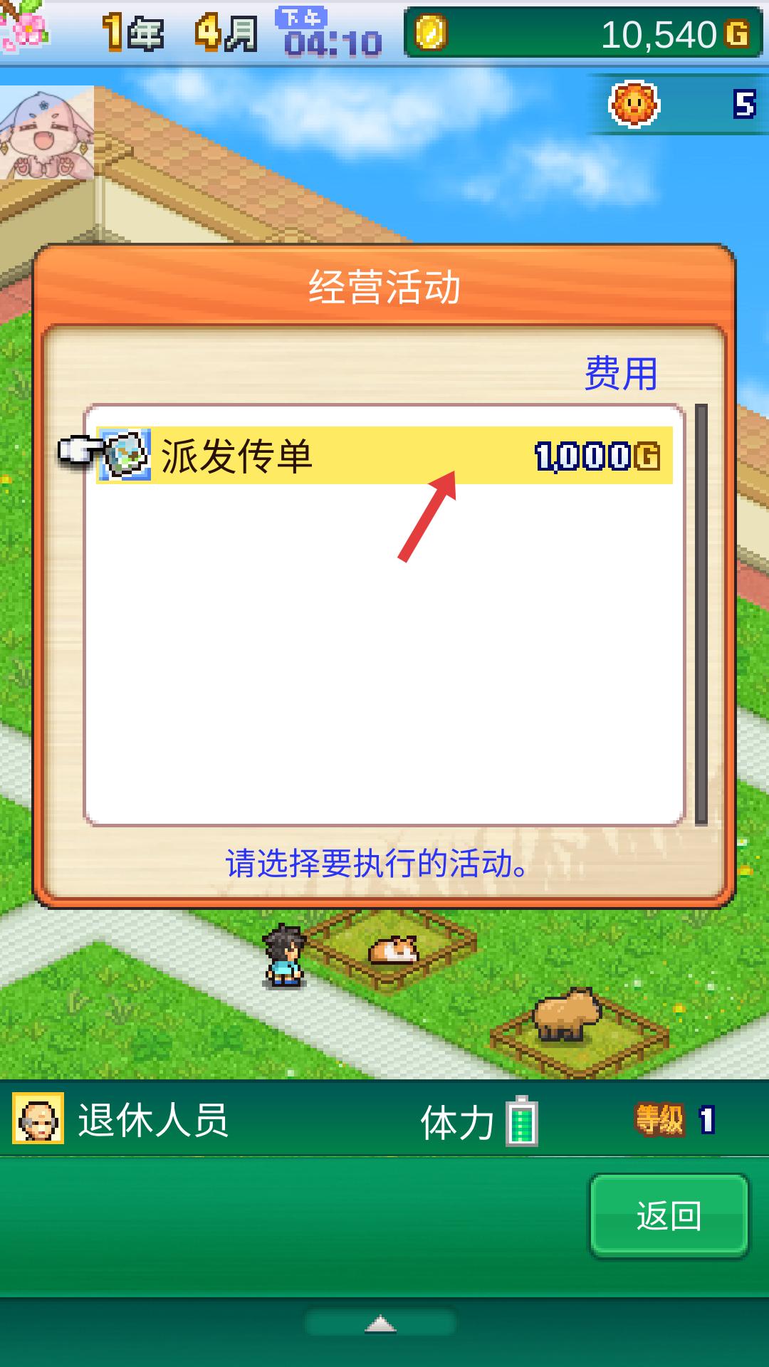 3、在經(jīng)營(yíng)活動(dòng)中選擇派發(fā)傳單,花費(fèi)1000G進(jìn)行宣傳,提升動(dòng)物園曝光度,吸引游客前來(lái),為動(dòng)物園帶來(lái)更多收益。