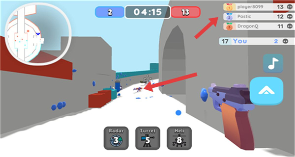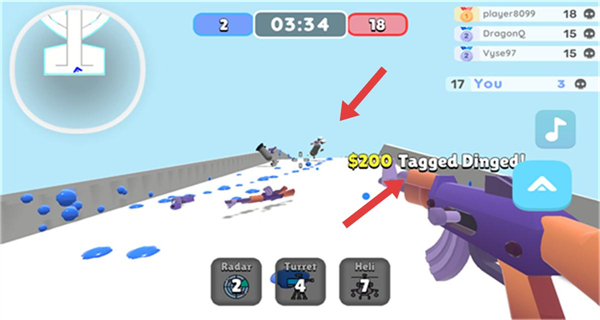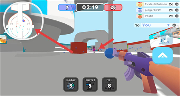 1、戰(zhàn)斗緊盯小地圖和敵方位置用彩彈攻擊紅隊(duì)敵人,通過優(yōu)先打積分高的對(duì)手快速削弱敵方戰(zhàn)力。