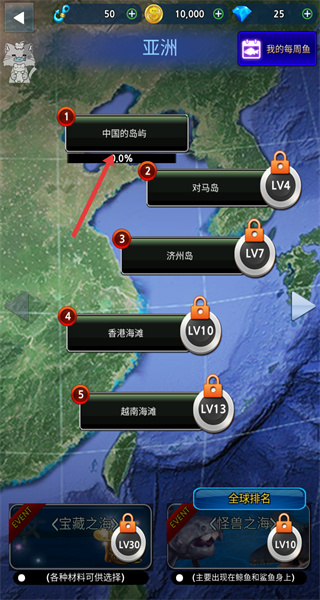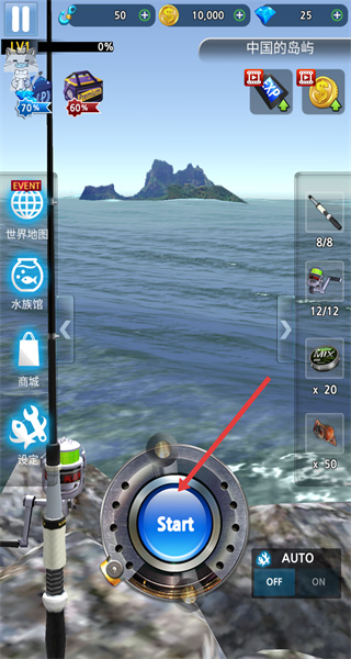 1、首先選擇釣魚地點(diǎn),如中國(guó)的島嶼,進(jìn)入該地點(diǎn)的釣魚場(chǎng)景,周圍是廣闊的海面和遠(yuǎn)處的島嶼,準(zhǔn)備開(kāi)啟釣魚挑戰(zhàn)。