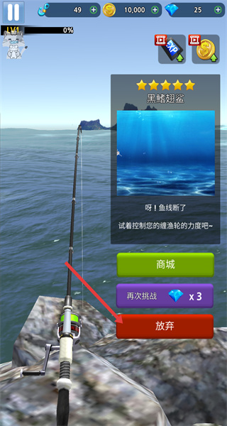 4、最后根據(jù)釣魚結(jié)果,選擇再次挑戰(zhàn)、進(jìn)入商城或放棄,若成功釣起可獲得相應(yīng)獎(jiǎng)勵(lì),失敗則可選擇重新嘗試或更換釣魚地點(diǎn)繼續(xù)挑戰(zhàn)。