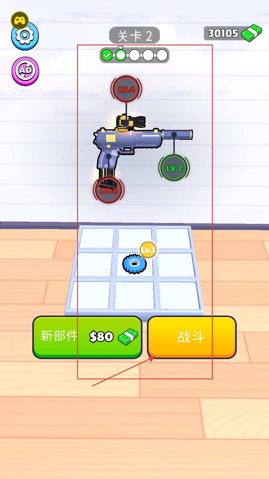 1、玩家在主界面,可對(duì)槍械部分部件升級(jí),可花費(fèi)80美元購買新部件,或點(diǎn)擊戰(zhàn)斗按鈕進(jìn)入關(guān)卡挑戰(zhàn)。