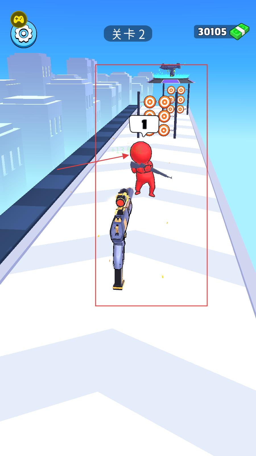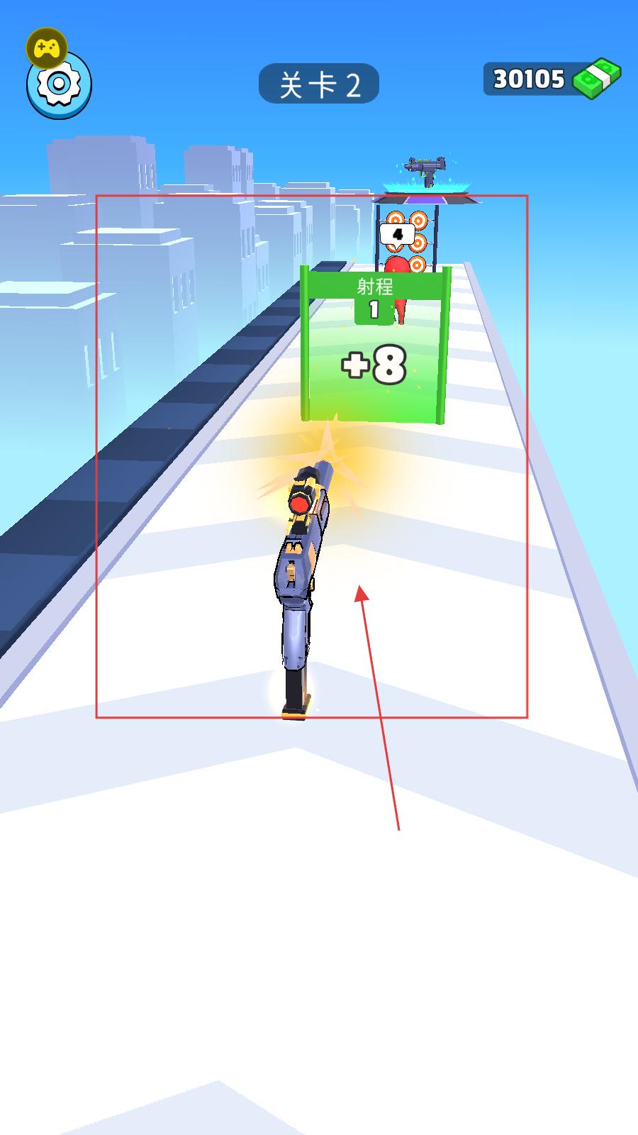 3、在關(guān)卡2中需要穿過射程升級(jí)區(qū)域,提升槍械射程屬性,更高效地射擊遠(yuǎn)處的靶標(biāo)和敵人。