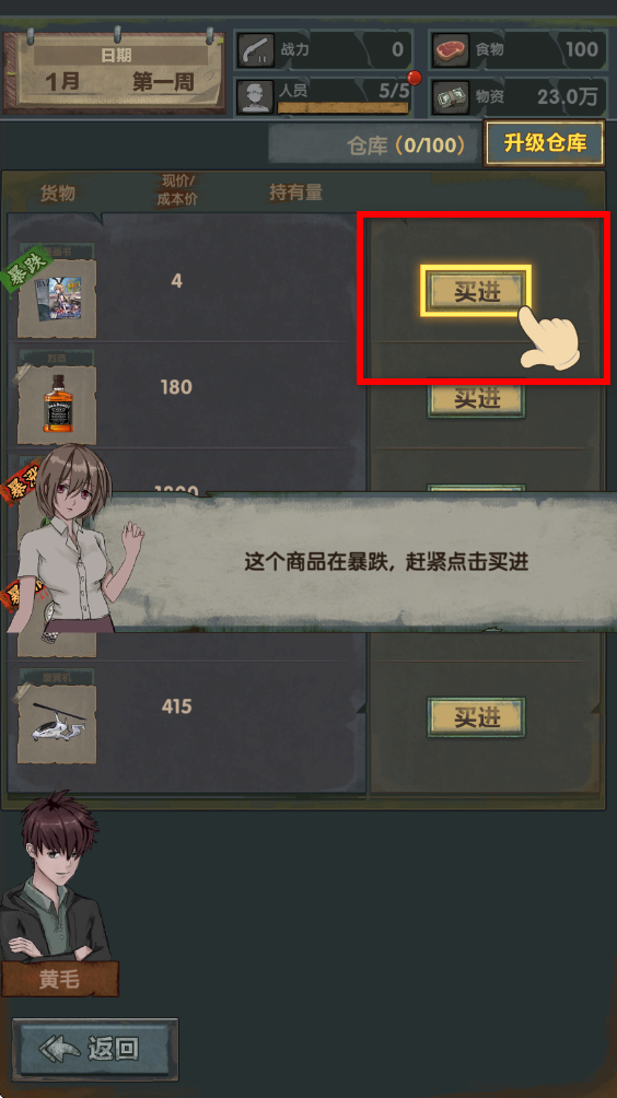 3、在黑市里面當(dāng)商品暴跌時趕緊點擊買進(jìn)按鈕,大量收購該商品,借此進(jìn)行物資囤積。
