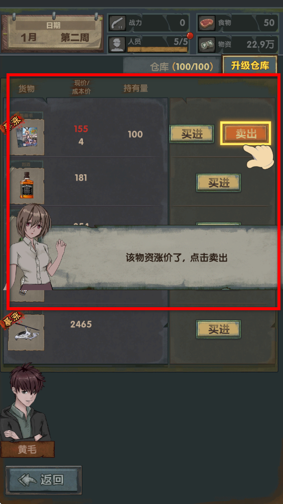 4、當(dāng)物資漲價時點擊賣出按鈕,及時出售該物資,借此獲取差價收益,有效提升資源儲備。