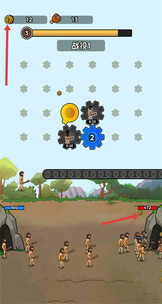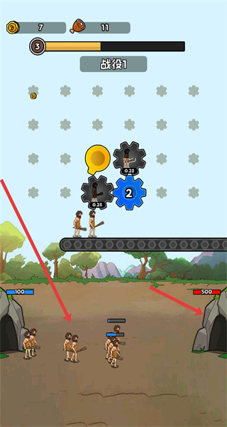 3、戰(zhàn)役中需要時刻關(guān)注兩側(cè)山洞出兵,合理分配己方的原始人在中間戰(zhàn)場攔截敵方與其戰(zhàn)斗爭取勝利。