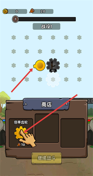 1、玩家進(jìn)入游戲開局需要在商店用初始的資源買倍率齒輪,提升收益效率點繼續(xù)戰(zhàn)斗開啟戰(zhàn)役1。