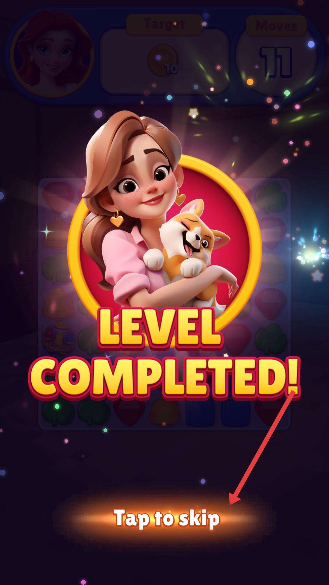 4、通關(guān)后點擊Tap to skip跳過動畫,領(lǐng)取獎勵,繼續(xù)挑戰(zhàn)下一關(guān),不斷積累金幣和經(jīng)驗,提升游戲等級。