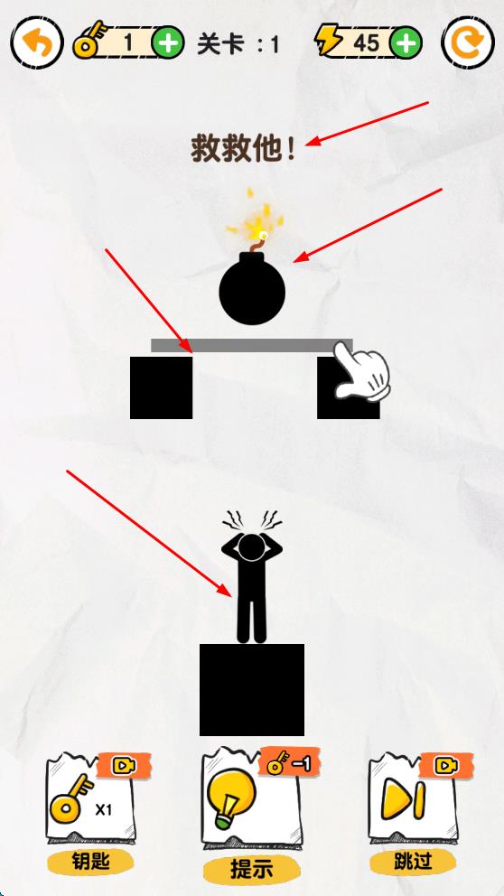 2、進入關卡后觀察炸彈與火柴人位置,快速用手指畫線連接平臺,阻擋炸彈掉落,保護火柴人,合理使用底部道具輔助。