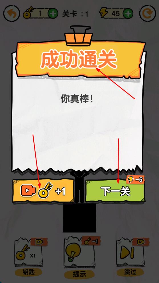 4、成功通關后,可選擇觀看視頻額外獲取鑰匙,或點擊下一關消耗體力進入新挑戰(zhàn),持續(xù)推進游戲進度。