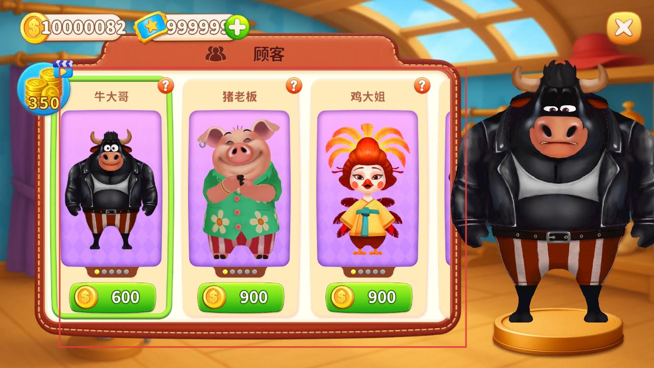 1、進入顧客界面,可花費金幣解鎖牛大哥、豬老板、雞大姐等不同顧客,解鎖后他們會來到餐廳,為你帶來多樣的烹飪訂單,開啟快節(jié)奏的廚房經(jīng)營之旅。
