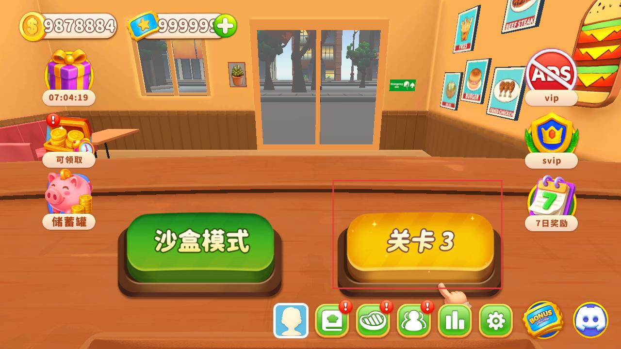 2、在主界面可選擇沙盒模式或關(guān)卡3開始游戲,同時能領(lǐng)取獎勵、使用儲蓄罐,還有7日獎勵等福利,為廚房經(jīng)營積累資源,助力廚藝提升。