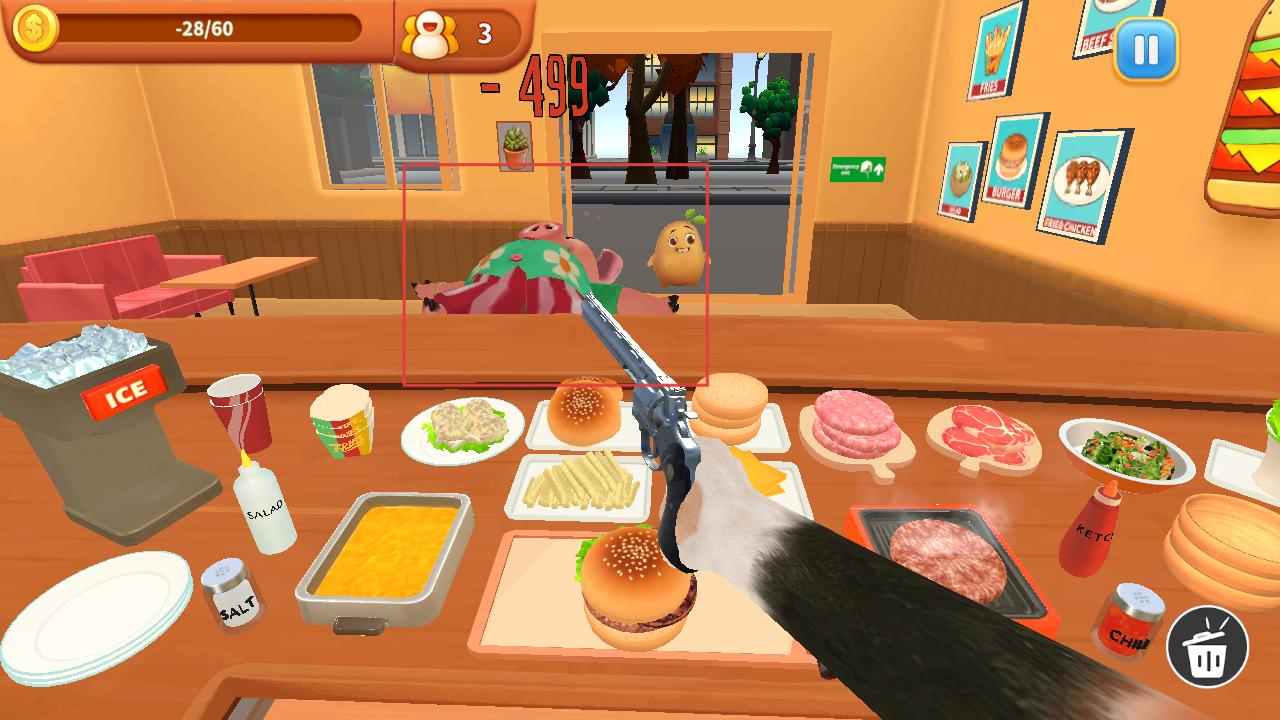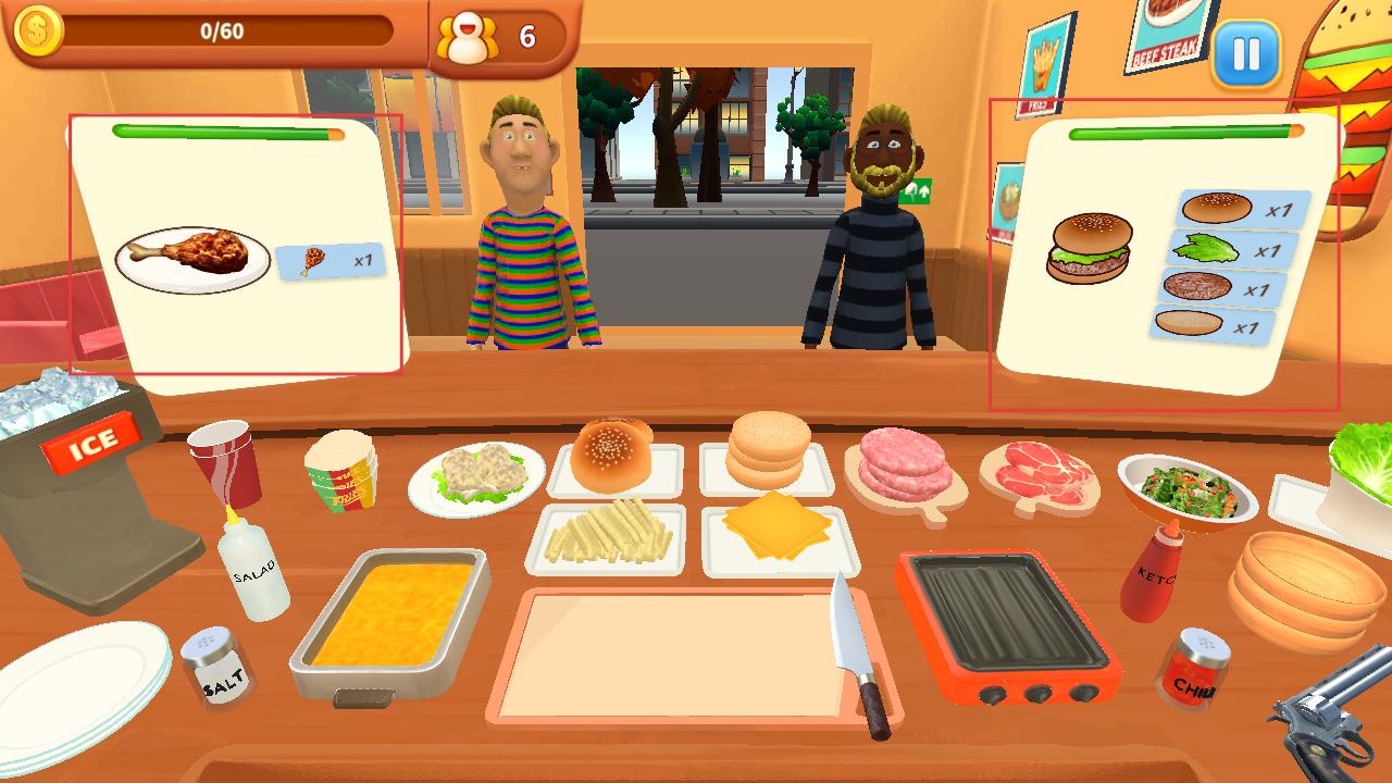 3、進入烹飪環(huán)節(jié),根據(jù)顧客訂單如雞腿、漢堡,快速準(zhǔn)備對應(yīng)食材,利用桌上的ICE、鹽、沙拉醬等調(diào)料和廚具,及時完成時限烹飪挑戰(zhàn),服務(wù)顧客。