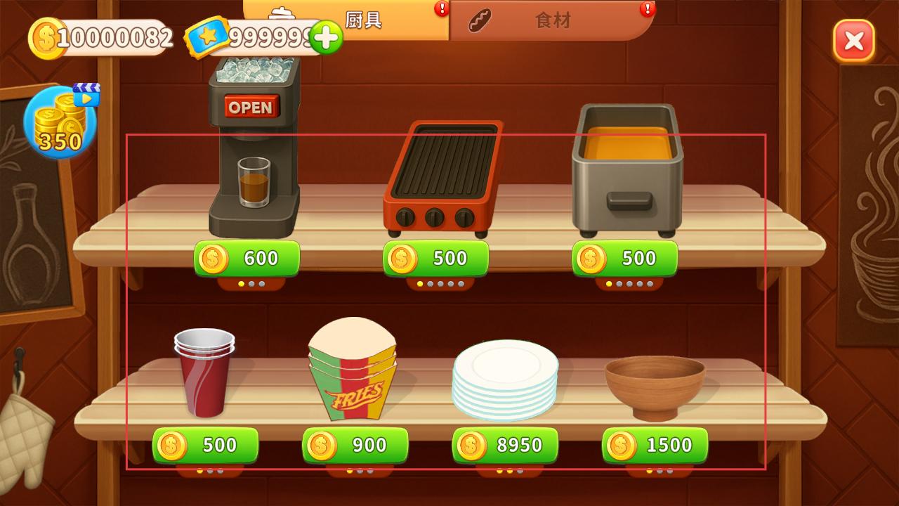 1、進入廚具食材界面,可花費金幣解鎖咖啡機、烤架、炸鍋等廚具,還有紙杯、薯條盒、盤子等餐具,提升廚房設備,為后續(xù)烹飪和經(jīng)營做好準備。
