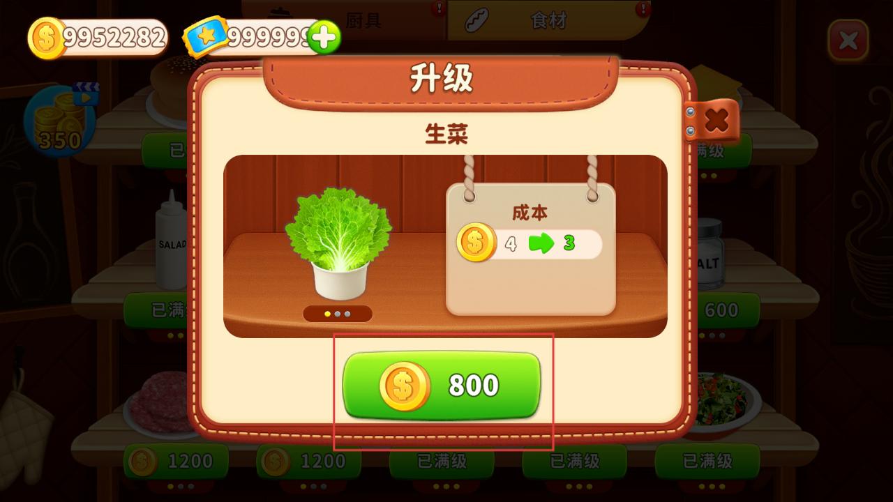 2、在升級界面,像生菜這類食材可花費金幣升級,降低其成本,提升食材性價比,讓料理制作和經(jīng)營更高效,激發(fā)更多創(chuàng)作可能。