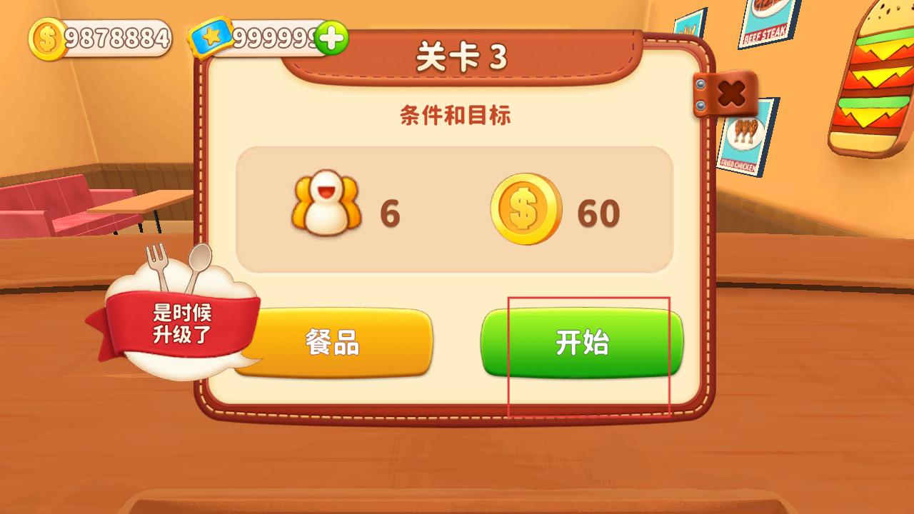 3、在關卡3界面,查看條件和目標后,點擊開始按鈕,即可進入快節(jié)奏的料理挑戰(zhàn),開始服務顧客,考驗烹飪技巧與反應能力。
