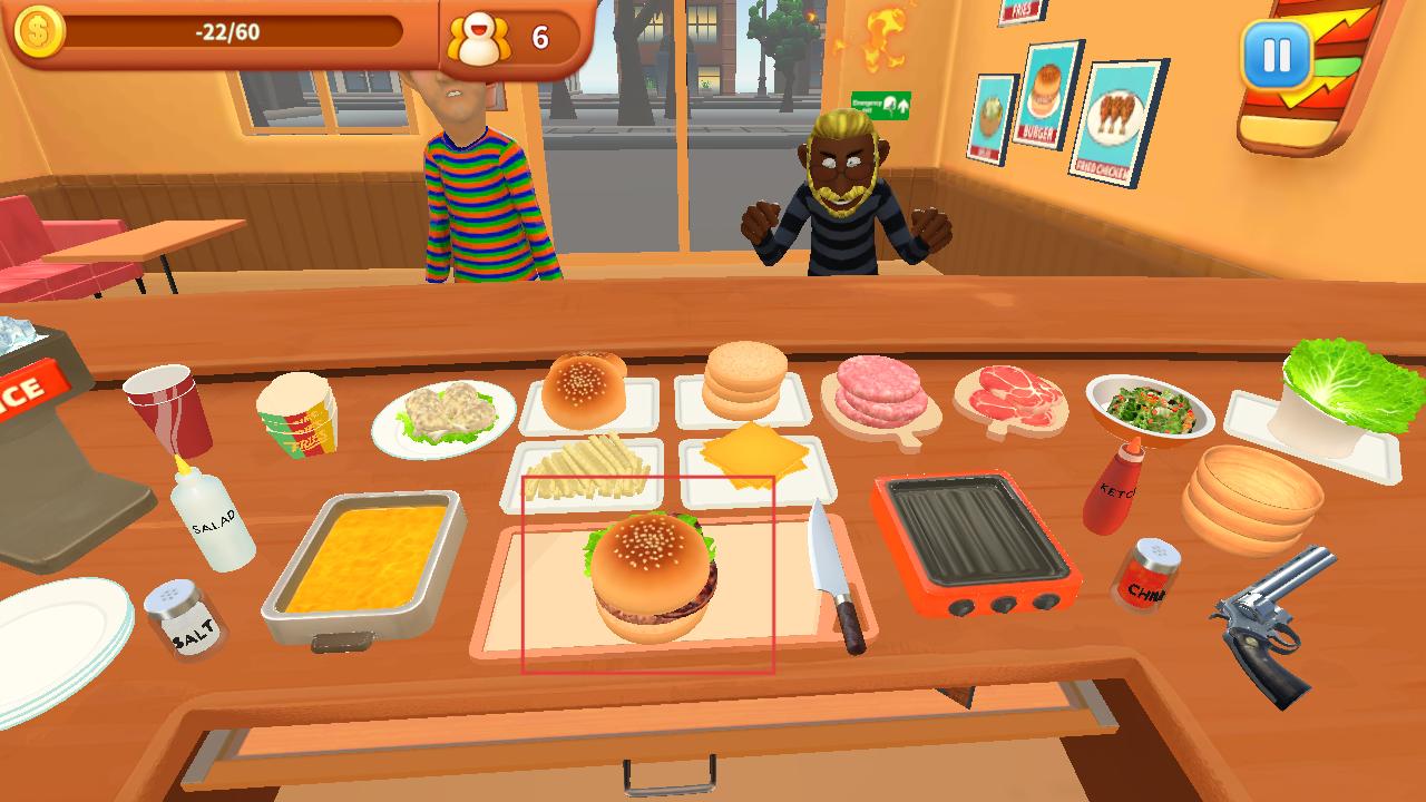 4、烹飪過程中根據(jù)顧客需求,利用桌上的面包、肉餅、生菜等食材,快速搭配制作漢堡等料理,將精準操作與創(chuàng)意搭配融合,完成料理訂單。