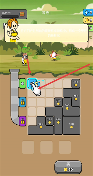 2、波次2選30金幣的藍色單元拖到綠色旁連線,擴大防御范圍看到地面寶箱,點打開拿增益助力防線輸出別讓敵人突破。
