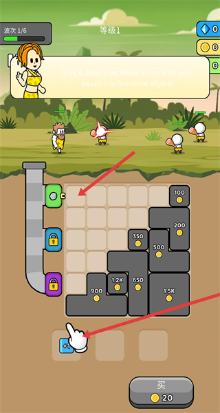 1、波次1時按指引拖藍色單元連綠色,花20金幣買放地下快速建基礎(chǔ)防線,優(yōu)先連靠近出怪口的格子攔截首波敵人。