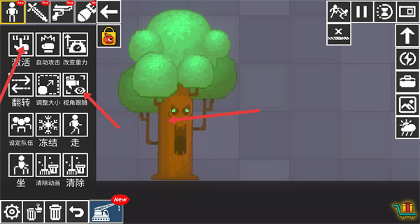 3、對(duì)場(chǎng)景里的角色物品善用操作菜單功能,比如給綠色樹(shù)木角色開(kāi)自動(dòng)攻擊,調(diào)整視角跟隨讓鏡頭鎖定用調(diào)整大小強(qiáng)化壓迫感讓場(chǎng)景更生動(dòng)。