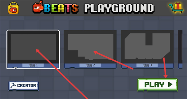 1、主界面選地圖1或其他地圖點(diǎn)擊PLAY進(jìn)入游戲,想自定義場(chǎng)景就點(diǎn)CREATOR進(jìn)入編輯模式,自由搭建專屬關(guān)卡從基礎(chǔ)地圖開(kāi)始熟悉玩法。