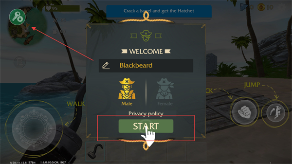 1、點(diǎn)擊START創(chuàng)建海盜角色進(jìn)入海島場(chǎng)景,也可運(yùn)用內(nèi)置菜單,幫助玩家更加輕松的生存尋找生存資源。