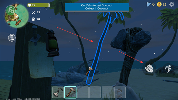 1、使用斧頭砍伐棕櫚樹獲取椰子,收集香蕉等食物資源,滿足生存需求,同時砍伐樹木、破壞容器獲取木材、金幣等建設(shè)和交易資源。
