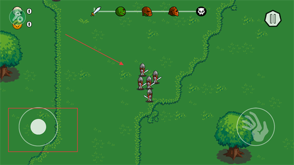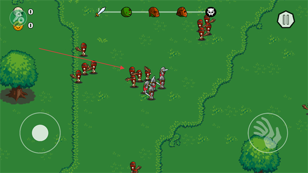 2、利用左側(cè)虛擬搖桿操控角色在戰(zhàn)場中移動,指揮士兵隊(duì)伍在草地、樹林間的地形中行進(jìn),尋找敵人并展開戰(zhàn)斗。