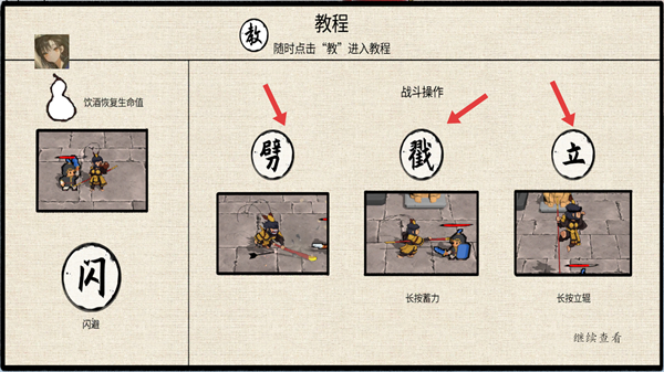 2、進(jìn)入教程界面后學(xué)習(xí)劈戳立等戰(zhàn)斗操作以及閃避和飲酒恢復(fù)生命值的方法,掌握這些基礎(chǔ)操作是戰(zhàn)斗的關(guān)鍵。