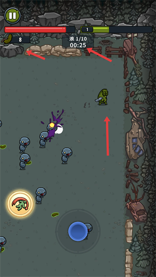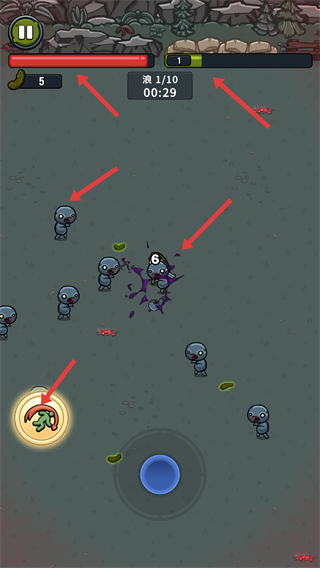 2、戰(zhàn)斗中關(guān)注自身生命值和波數(shù)進(jìn)度利用移動(dòng)操縱桿躲避敵人,同時(shí)攻擊周圍的敵人收集場(chǎng)景中的物品提升戰(zhàn)斗效率。