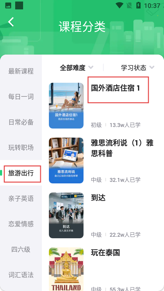 1、課程分類界面的旅游出行專區(qū),呈現(xiàn)國外酒店住宿1等課程,標(biāo)注難度與學(xué)習(xí)人數(shù),覆蓋旅游英語多場(chǎng)景。