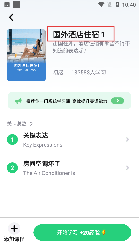 2、國外酒店住宿1課程頁,聚焦出國住宿英語表達(dá),設(shè)2個(gè)關(guān)卡為海外住宿交流提供語言支持。