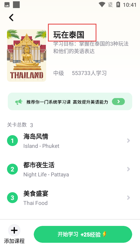 3、玩在泰國課程頁面,以掌握泰國3種玩法英語表達(dá)為目標(biāo),含海島都市美食3大主題內(nèi)容。