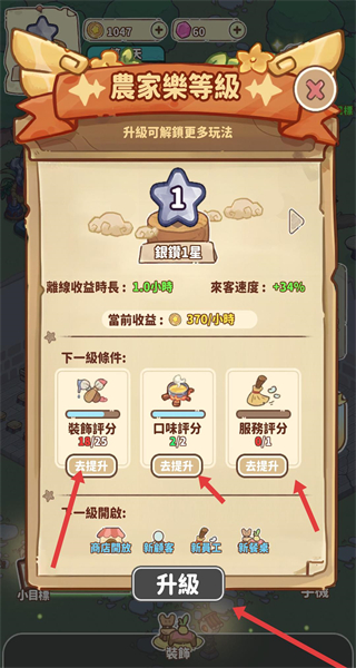 1、升級(jí)農(nóng)家樂前缺裝飾點(diǎn)去提升,買新桌椅擺件缺口味備足食材商店買青菜研發(fā)新菜,缺服務(wù)招員工提升客人接待效率。
