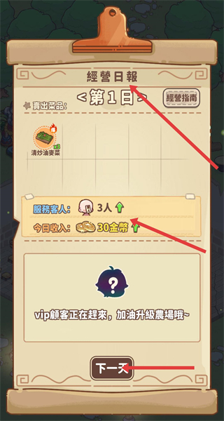 2、經(jīng)營日報(bào)看服務(wù)客人收入數(shù)據(jù)少的話優(yōu)化流程,裝飾升級(jí)吸引更多客備足食材加快出菜,員工分工明確點(diǎn)下一天前清完當(dāng)日任務(wù)領(lǐng)滿獎(jiǎng)勵(lì)。