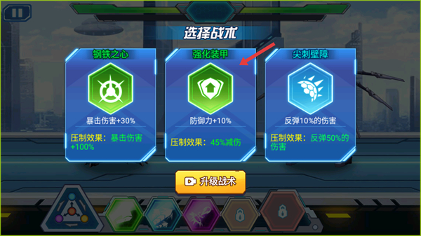 1、戰(zhàn)斗前選擇戰(zhàn)術(shù)如強化裝甲提升防御力,根據(jù)戰(zhàn)術(shù)的屬性和壓制效果進行搭配為戰(zhàn)斗做好屬性加成準備。