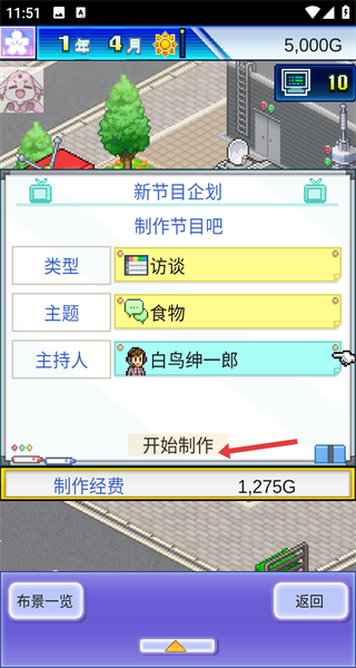 3、在節(jié)目規(guī)劃界面,選擇節(jié)目類型、主題和主持人,確認后點擊開始制作,啟動節(jié)目制作流程。